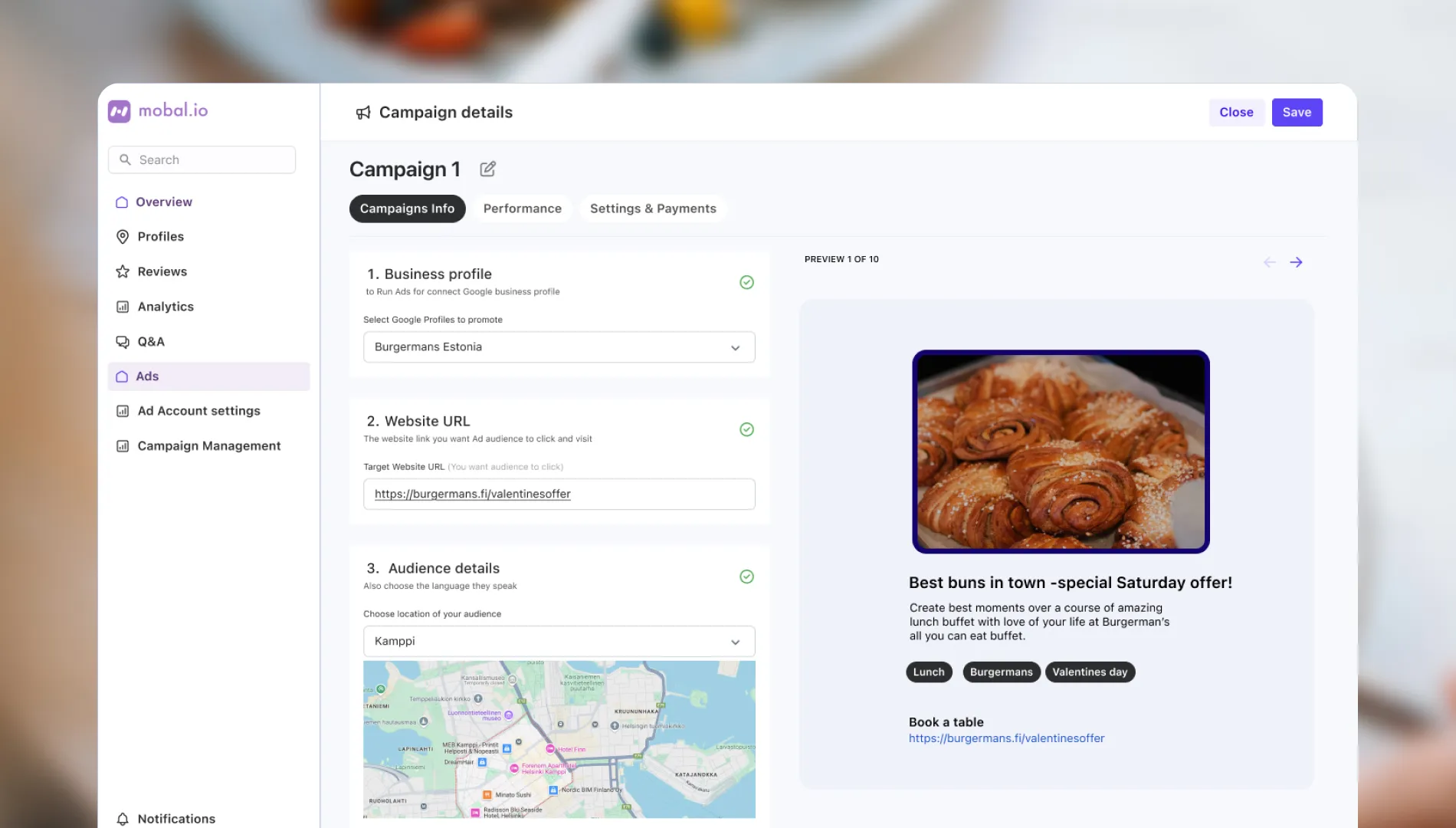 • Leverage Mobal’s Google Local Campaigns to easily create and manage hyper-local ads that appear on Google Search, Maps, and YouTube, driving more customers to your restaurant at peak times.