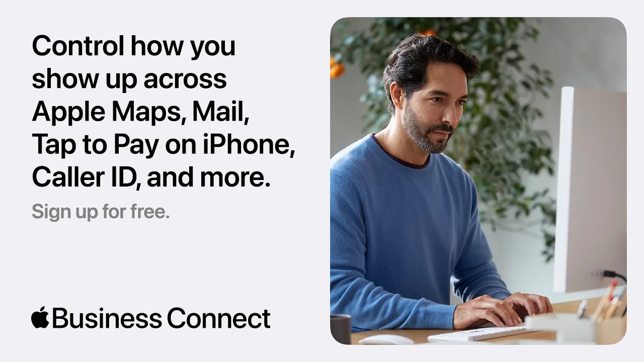 • Apple Business Connect puts you in control: Claim, update, and optimize your listing from one dashboard.