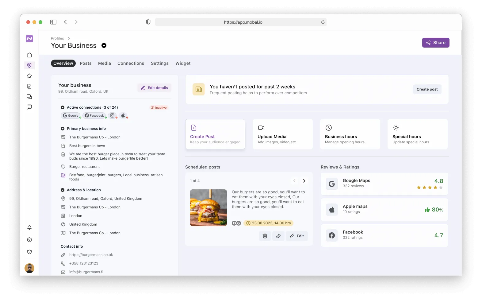 Mobal erbjuder enkel hantering av affärsprofiler. Om du har ett Apple Place Card har du troligtvis också en Google Business-profil och en Bing-profil att hantera.